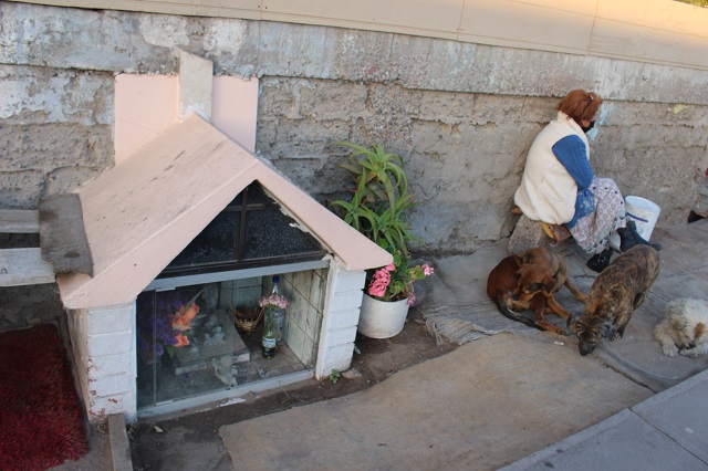 La señora Eliana González descansa junto a sus perros al lado de la tumba de Marcia Barrera Clavería en la esquina de las calles Lautaro con Monjitas la tarde del 24 de diciembre de 2020. Es víspera de navidad, pero que para los vecinos del sector aún tiene un recuerdo trágico. El jueves 25 de diciembre de 2020 se cumplen 40 años que la menor de 11 años murió atropellada por el conductor de un camión cuando jugaba alegremente con los regalos que le había traído el Viejito Pascuero.