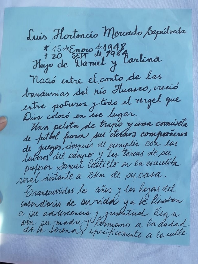 La familia Mercado Gálvez nuevamente llegó hasta este lugar para recordar la muerte de Luis Mercado Sepúlveda, quien murió un 20 de septiembre de 1984 a la edad de 33 años mientras jugaba fútbol junto a sus amigos y familiares La pérdida fue sentida. Sobre todo por sus hijas. Es por ello que verlas arreglar la tumba de su progenitor conmueve. A pesar que han pasado más de tres décadas, confiesan que el cariño y el recuerdo están intactos.